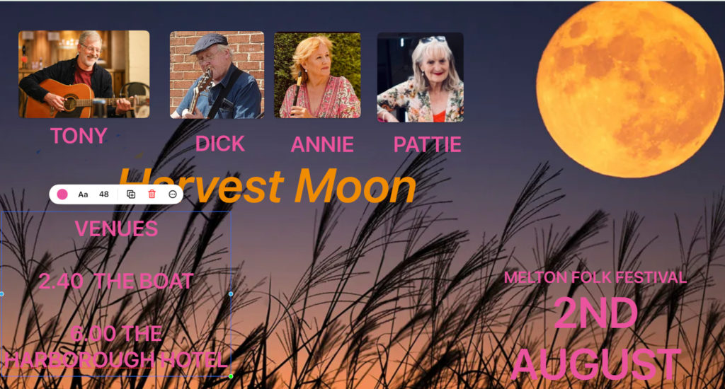 Through the love of friendship music and harmonies our band Harvest Moon was born. We met at the Barrowby singaround and have recently had music workshops with the renowned Lincolnshire duet the Rye Sisters mastering our Americana harmonies and songs from the Wailin Jennies.