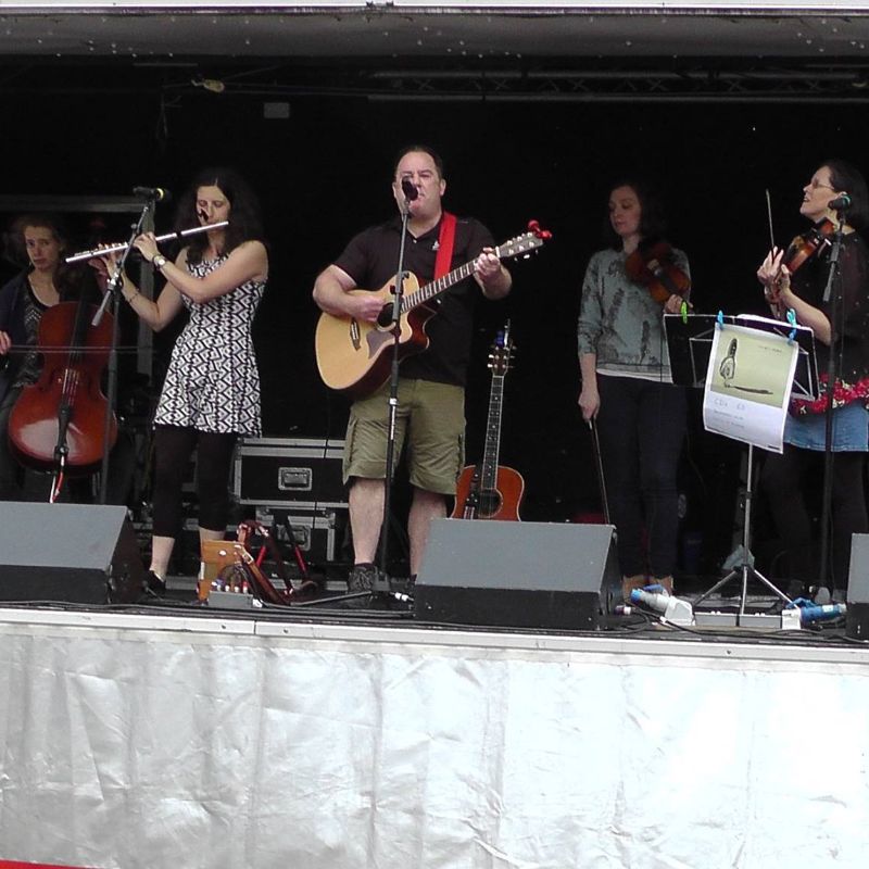 All the band members sing and, between them, play guitars in various tunings, mandolin, mandola, bouzouki, flute, piccolo, various whistles, BC and DG melodeon, piano accordion, English concertina, bodhran, saxophone, ‘cello, bass guitar and violins; lots of violins. Our most common line up is a five or six piece with at least two violins, flute, guitars and multiple vocals plus whatever instruments get brought along but we are happy to increase or decrease in size to fit the occasion. We have played as a two piece with Mark on guitar and Catherine on violin and in pretty much every other combination up to a nine piece when everyone’s been available!